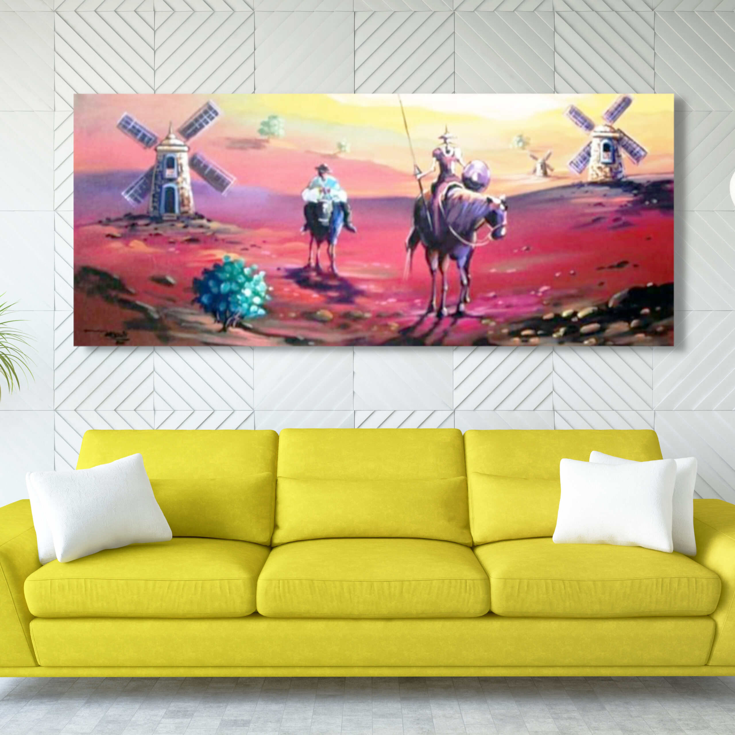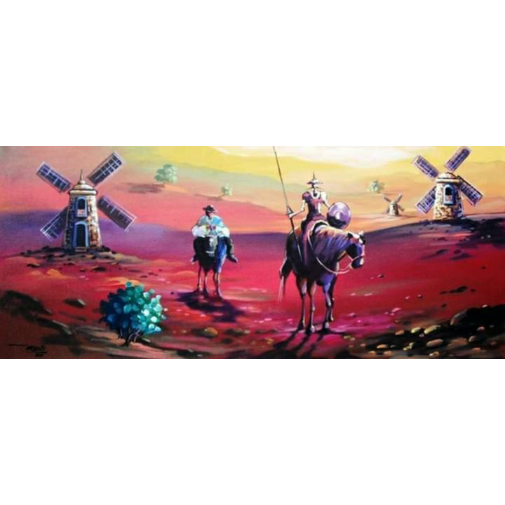 Neste acrílico sobre tela, o artista captura a essência da aventura intemporal de Dom Quixote e seu fiel escudeiro, Sancho Panza, em sua jornada por um mundo povoado por gigantes e moinhos de vento – ou, na visão quixotesca, monstros terríveis.