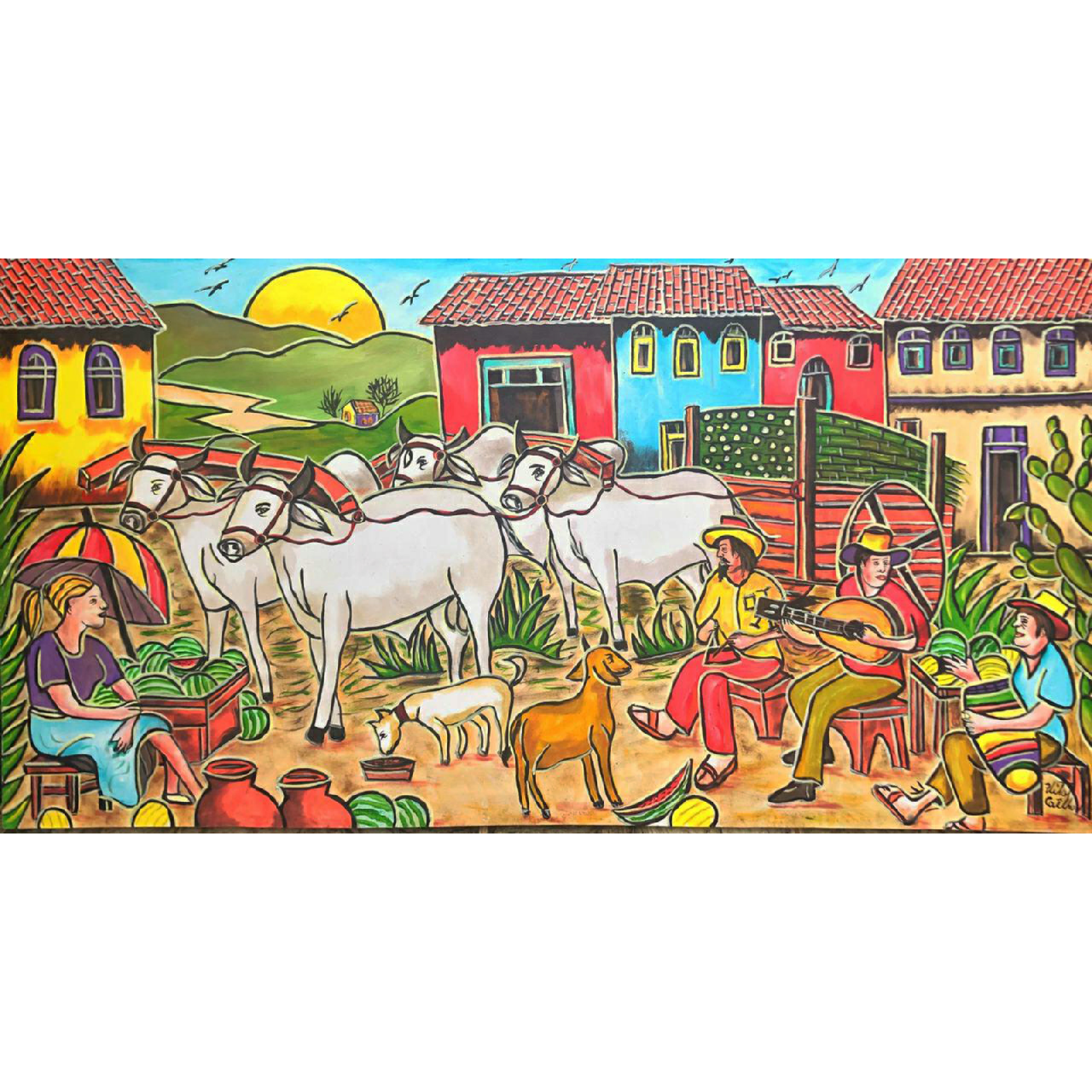 A sua imponência é suavizada pela cena de convívio que acontece ao seu redor: uma mulher sentada, vendendo melancias, símbolo da fertilidade e da relação do sertanejo com a terra; músicos que, com seus instrumentos, criam a trilha sonora deste quadro, evocando a importância da música e da festa na cultura sertaneja.