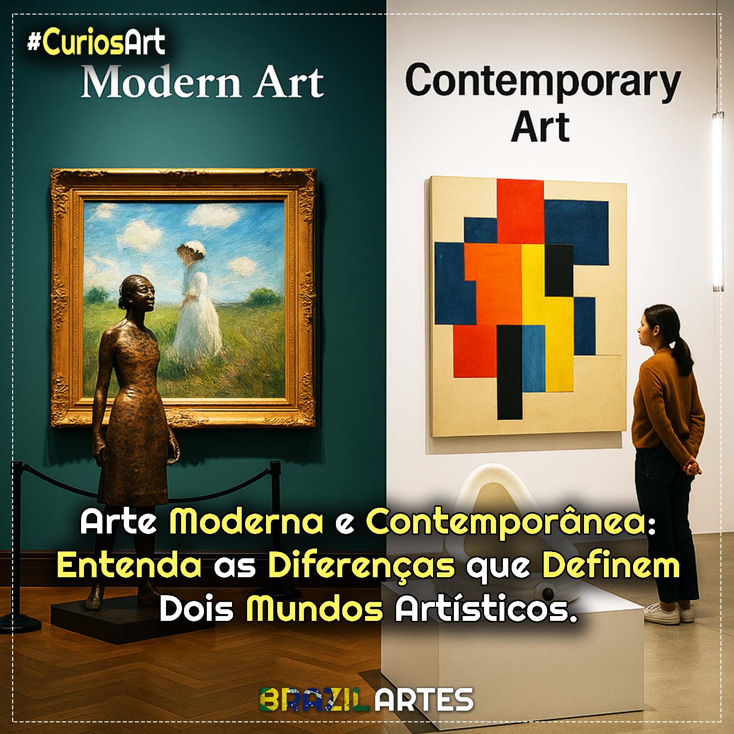 A arte moderna (fins do século XIX a meados do XX) buscava rupturas estéticas e sistemas universais. Já a contemporânea (pós-Segunda Guerra) é marcada pela pluralidade, pela provocação e pela diversidade de suportes.