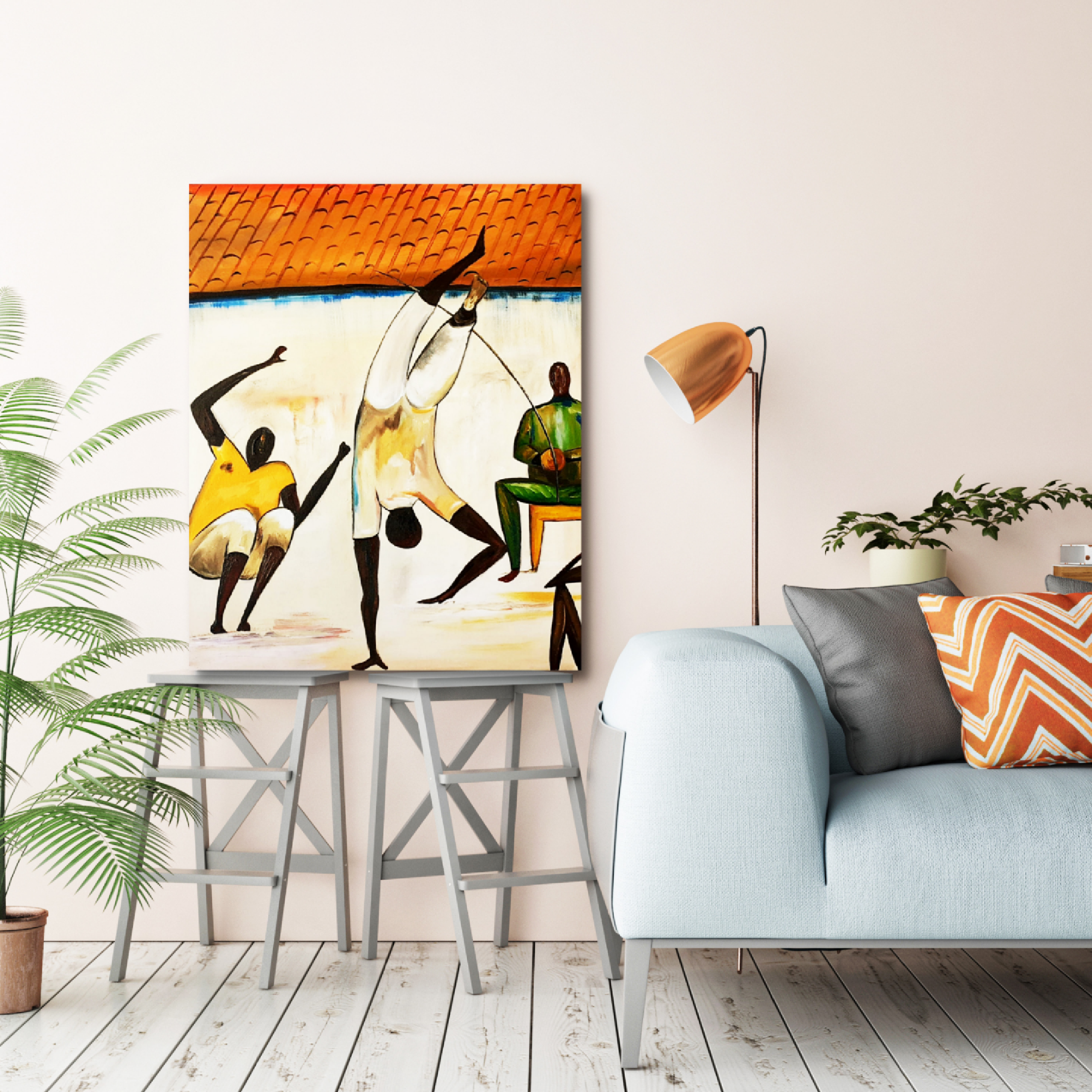 “Capoeira” é uma explosão de movimento e harmonia, uma tela que captura a essência da arte marcial afro-brasileira nascida na Bahia.