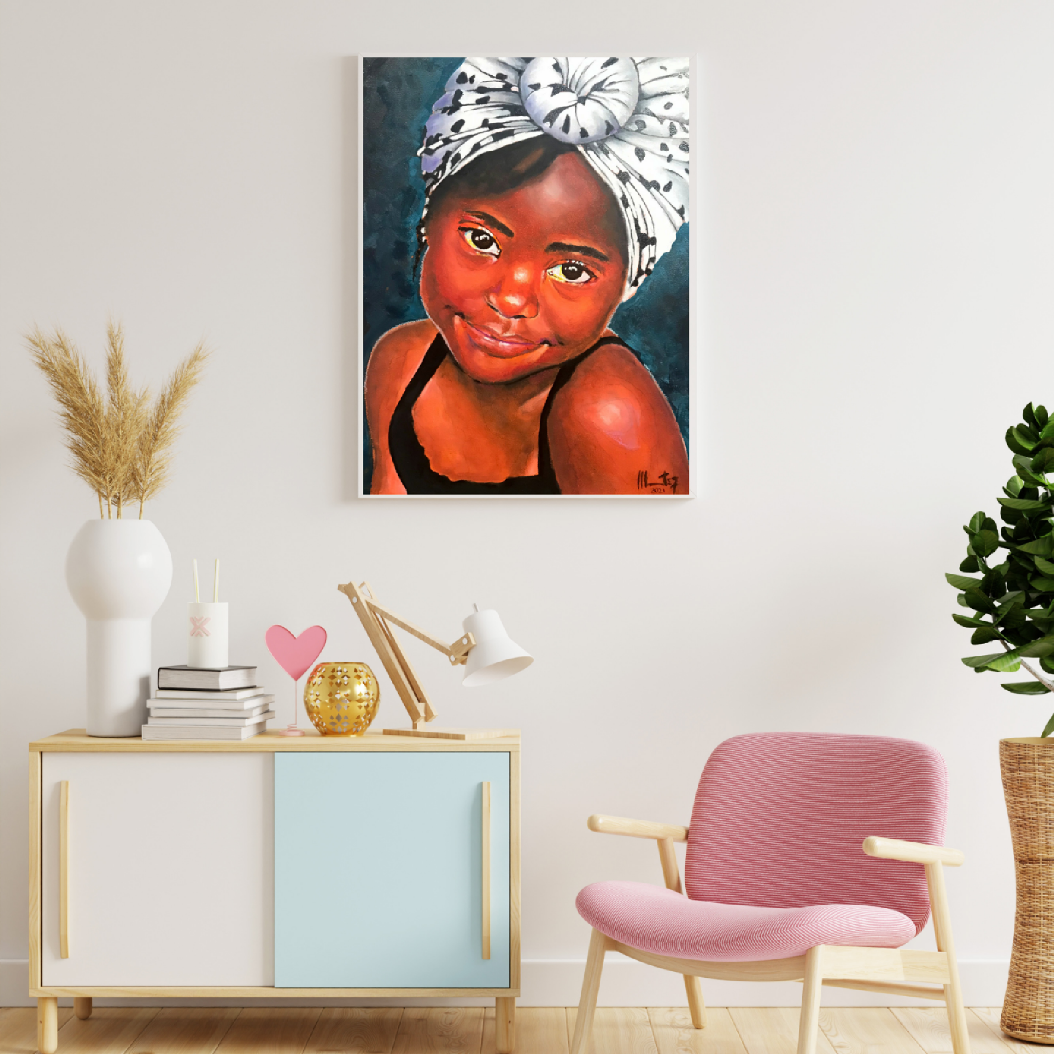 A escolha das cores e o contraste entre o turbante e a pele adicionam um dinamismo visual à peça, destacando a personalidade e a presença da menina.