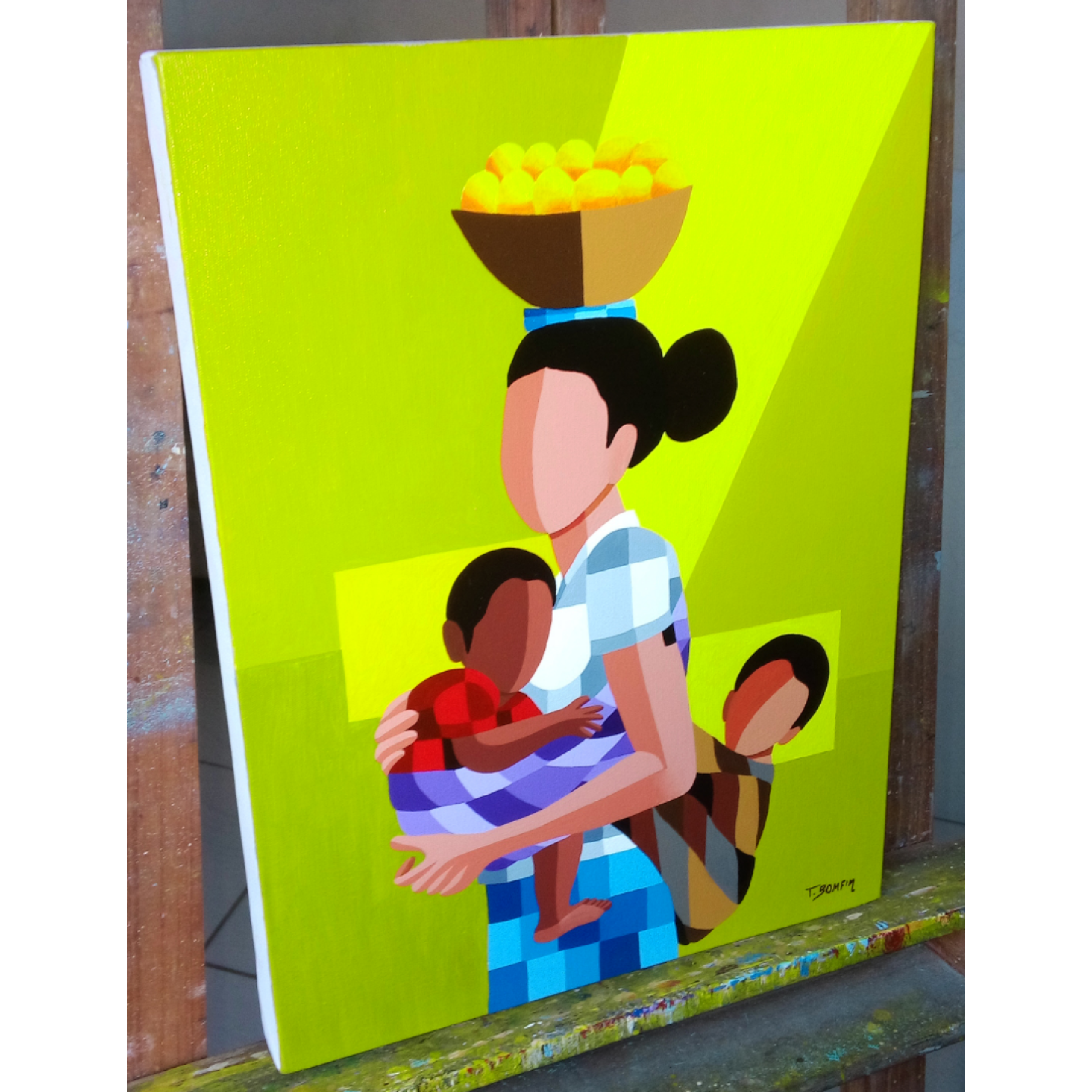 No centro da composição está a figura de uma mulher de pé, forte e centrada, com um cesto de frutas amarelas equilibrado na cabeça — um símbolo de sua habilidade e equilíbrio. Ao mesmo tempo, ela carrega seu filho mais novo nos braços, que se agarra a ela confiantemente, e um segundo filho a abraça pelas costas.
