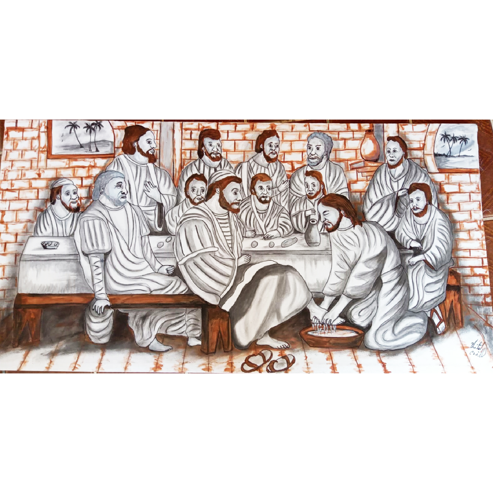 Obra Jesus Lava os Pés por Vital Coelho, dimensões 120x60cm, produzida em 2022 pela técnica Acrílico sobre tela! Disponibilidade: Pronta-Entrega.