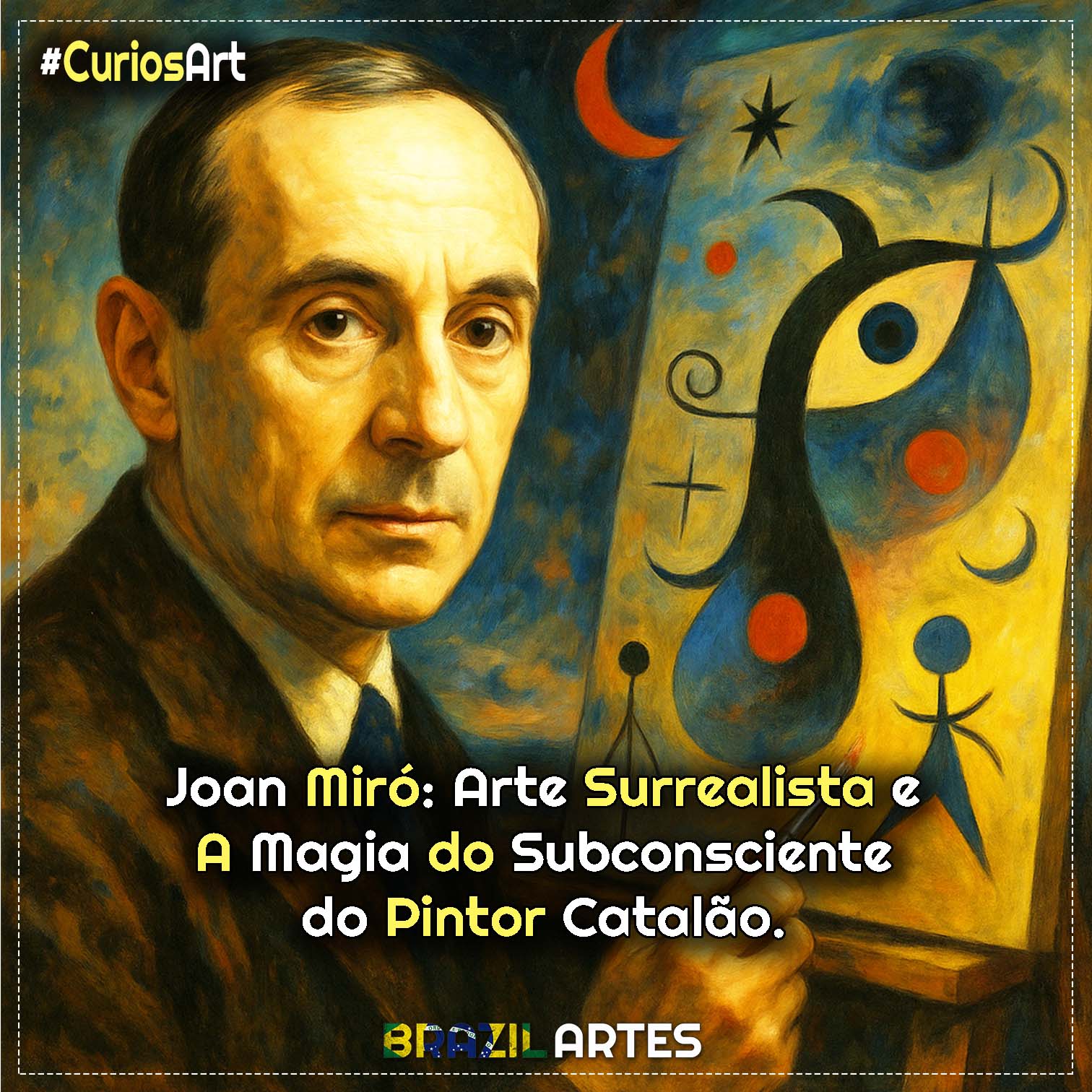 Em Miró, o surrealismo é poético e intuitivo. Ele não retratava sonhos literais, mas traduzia o inconsciente em ritmo, cor e movimento, criando uma linguagem livre e simbólica.