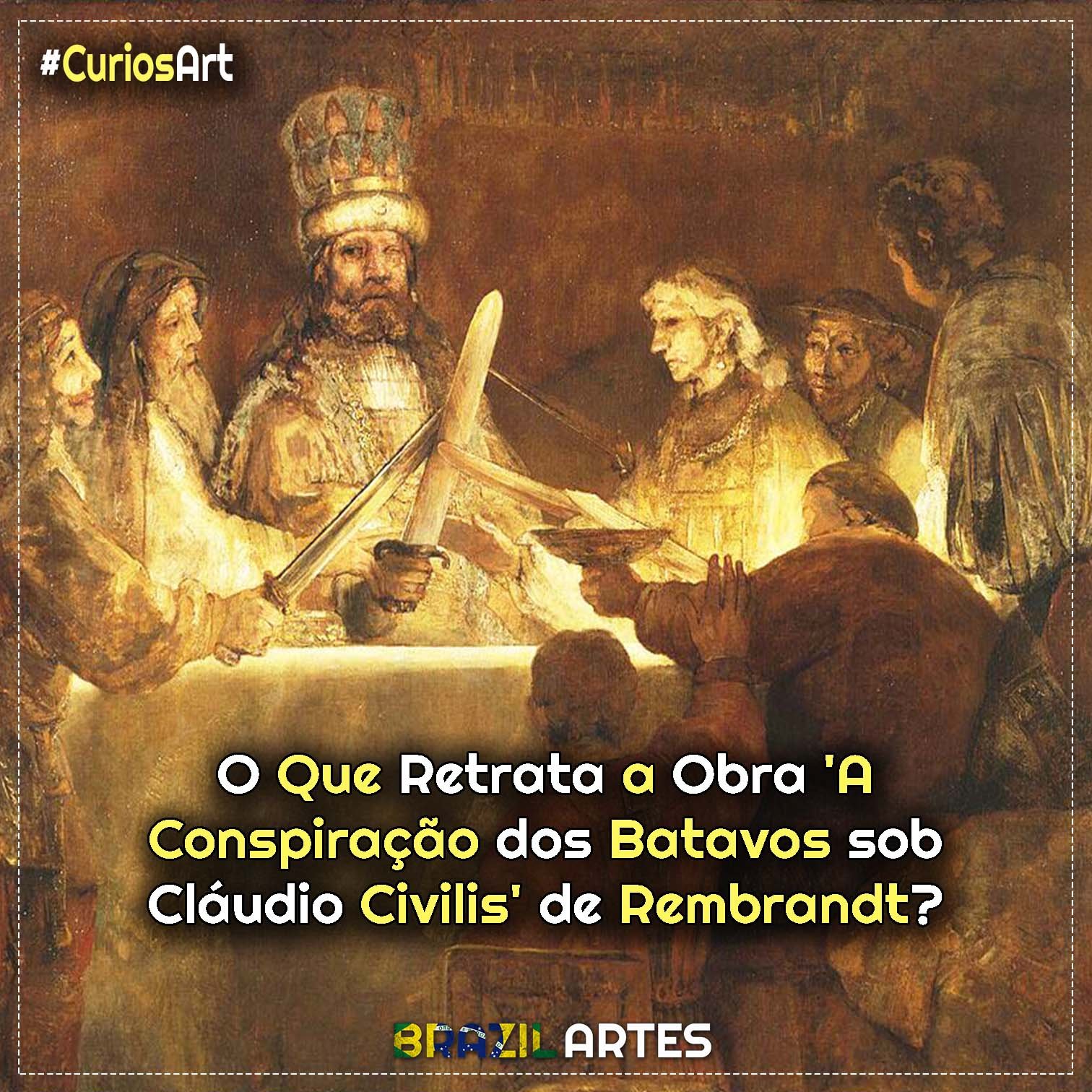 A pintura retrata o momento do juramento dos líderes batavos contra o domínio romano. Rembrandt concentra a cena na decisão política, não na ação militar, enfatizando o peso moral do pacto.