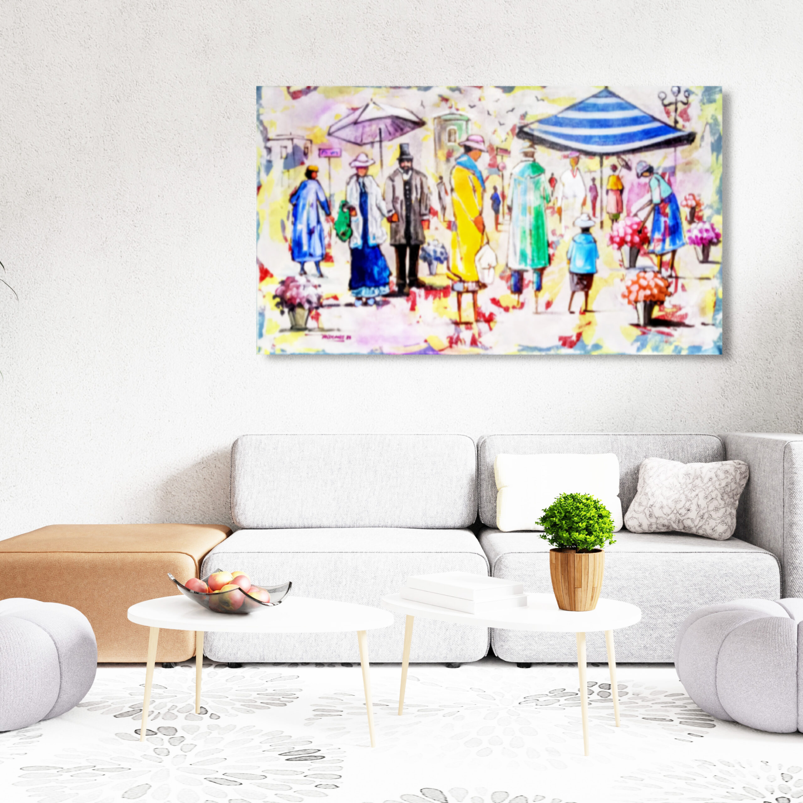 Cada personagem é único, contando sua própria história e contribuindo para a narrativa coletiva da cena. Guarda-chuvas abertos, cestos de flores, e a postura relaxada dos passeantes transmitem uma atmosfera de lazer e prazer.
