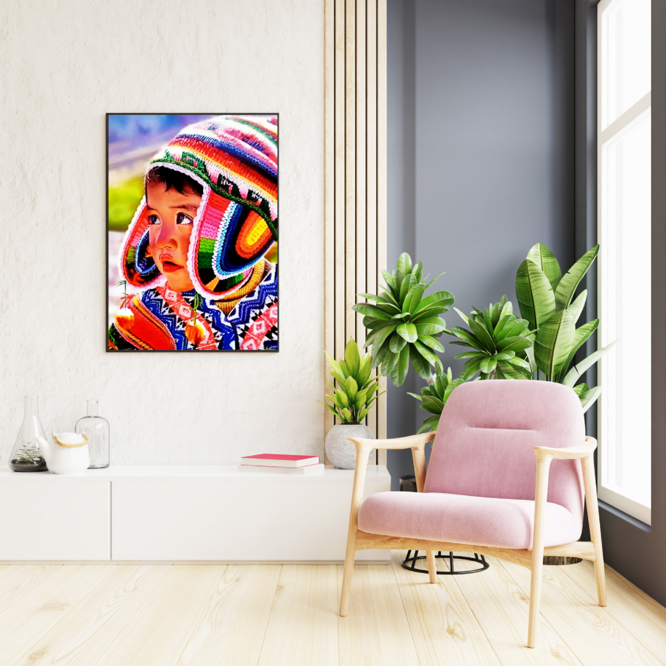 A tapeçaria de cores entrelaçadas no vestuário da criança é um feito impressionante de representação artística, onde cada matiz e padrão é uma narrativa em si, tecida com a história e a identidade do povo peruano. A textura palpável do tecido é tão realista que quase se pode sentir o peso e a suavidade das fibras sob os dedos.