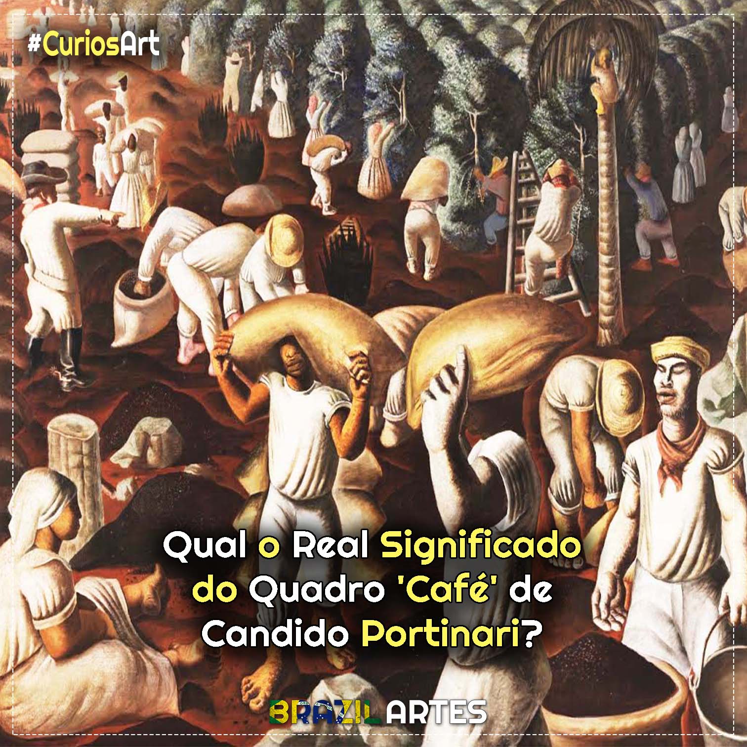 A obra mostra trabalhadores rurais em diferentes etapas da colheita do café. Portinari transforma a cena cotidiana em símbolo da formação econômica do Brasil, destacando esforço físico, desigualdade histórica e a centralidade desses trabalhadores na construção do país.