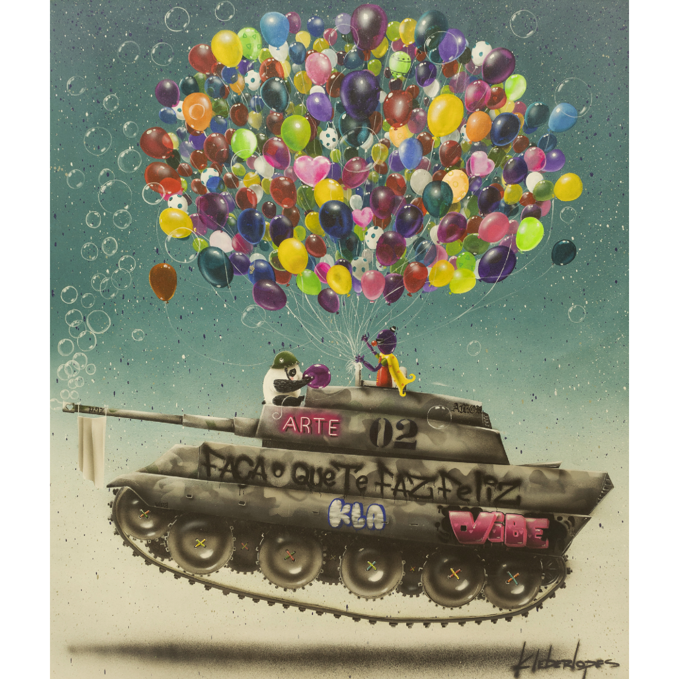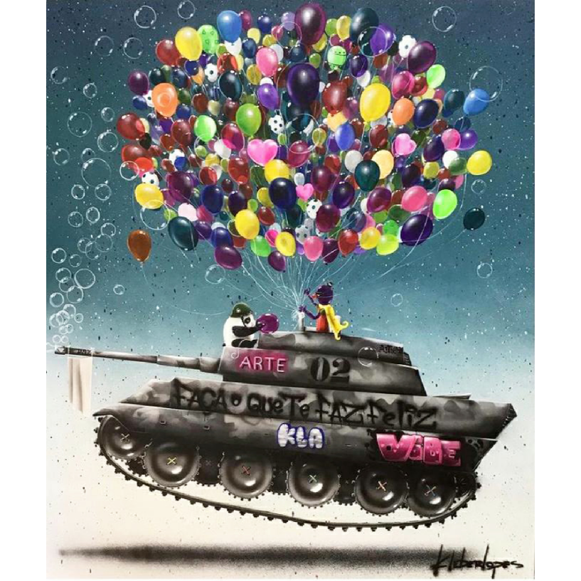 A obra “Tanque dos Sonhos” de Kleber Lopes, medindo 120x140cm, é uma fantástica manifestação de criatividade e esperança, utilizando acrílico sobre tela. Este trabalho desafia as noções convencionais de guerra com um tanque que, em vez de armas, distribui bolhas de sabão e é levantado por balões coloridos, simbolizando a leveza e o colorido dos sonhos em contraste com a dureza do metal.