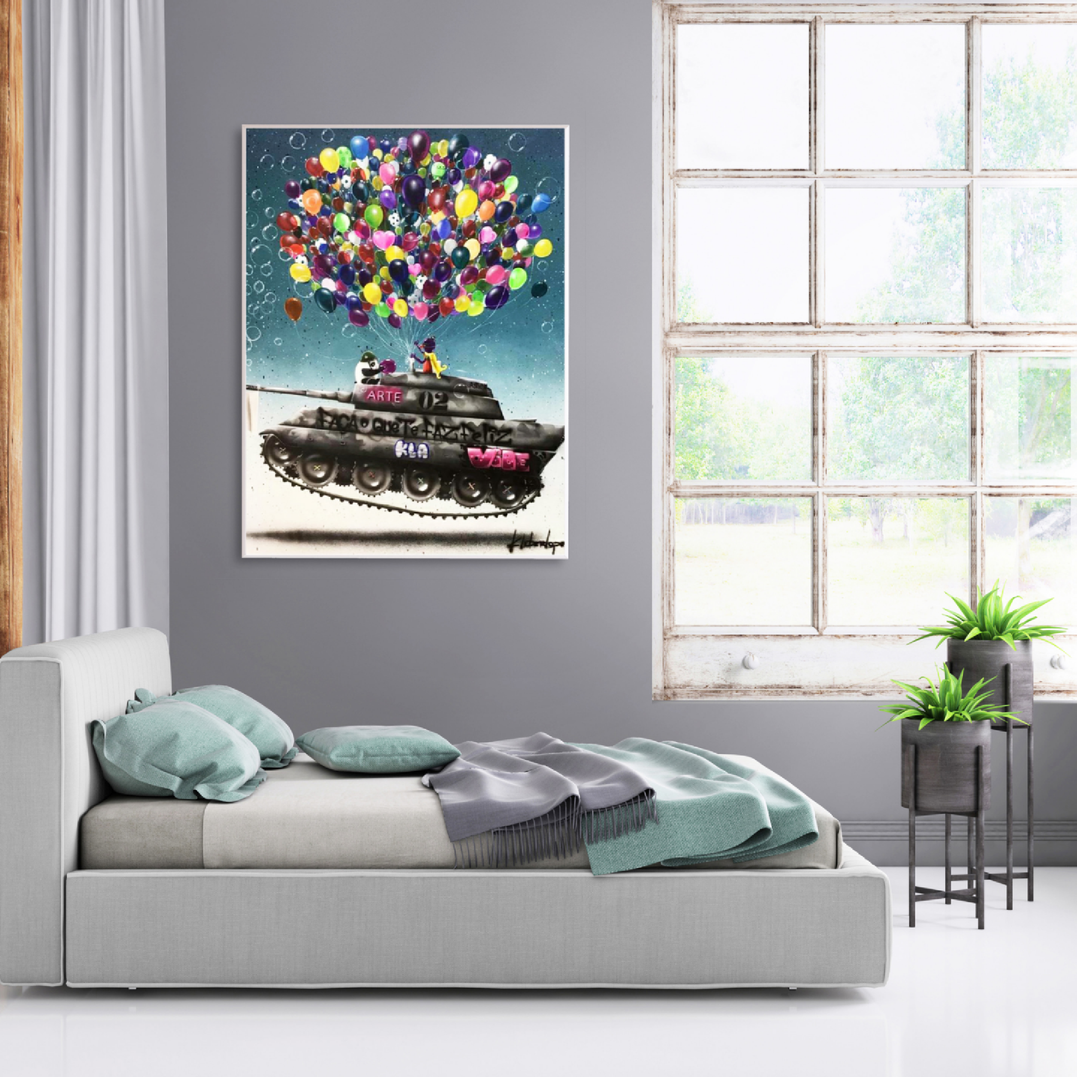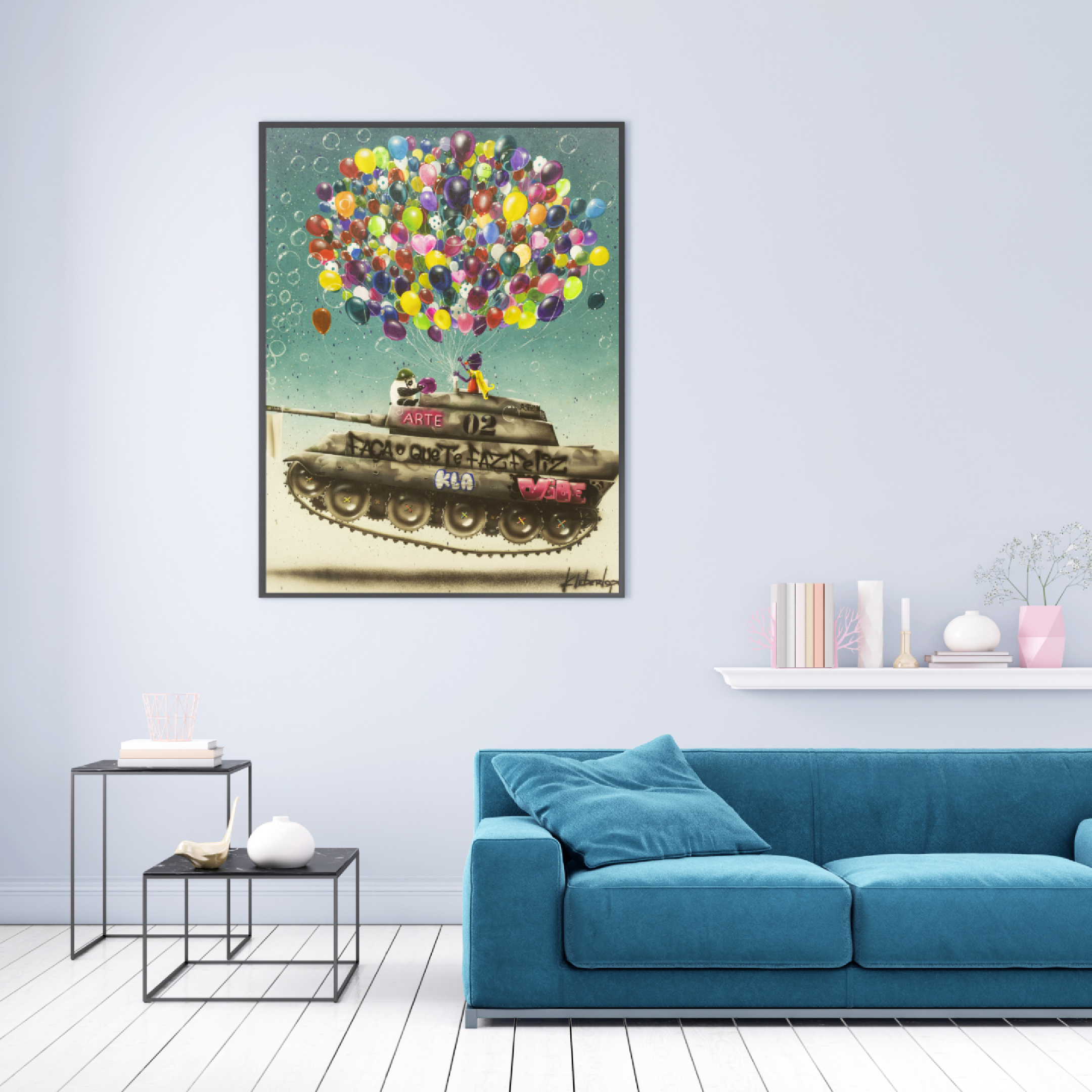 A bandeira branca estendida é um símbolo universal de paz, reforçando a mensagem de que mesmo as máquinas de guerra podem ser transformadas em veículos de alegria e harmonia. O fundo azulado da tela evoca um sentimento de calma e infinito, enquanto a sombra do tanque saindo do chão na parte inferior da tela adiciona profundidade e um toque de realismo a esta cena surreal.